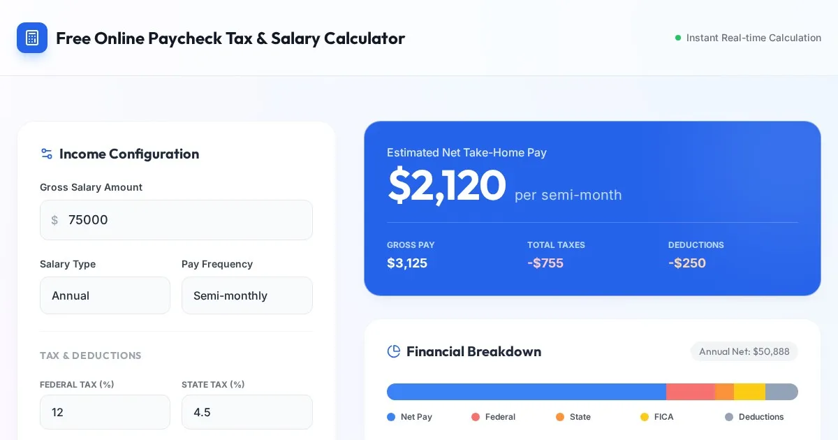Calculate your take-home pay accurately with our free online paycheck tax and salary calculator. Determine net income after federal, state, and FICA taxes.