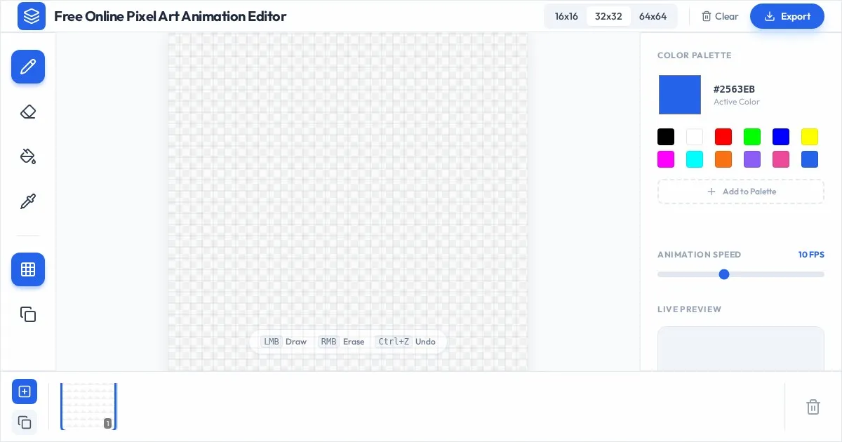 Create pixel art and sprite animations with our free online editor. Features frame-by-frame controls, custom color palettes, and instant GIF export. No sign-up.