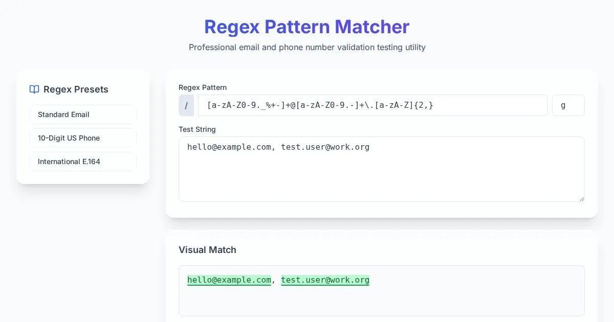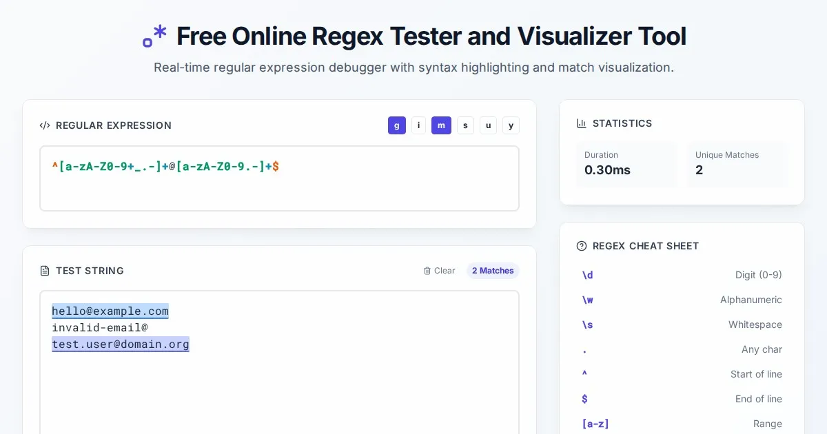 Professional free online regex tester for validating and visualizing regular expressions. Debug regex patterns in real-time with an integrated syntax cheat sheet.