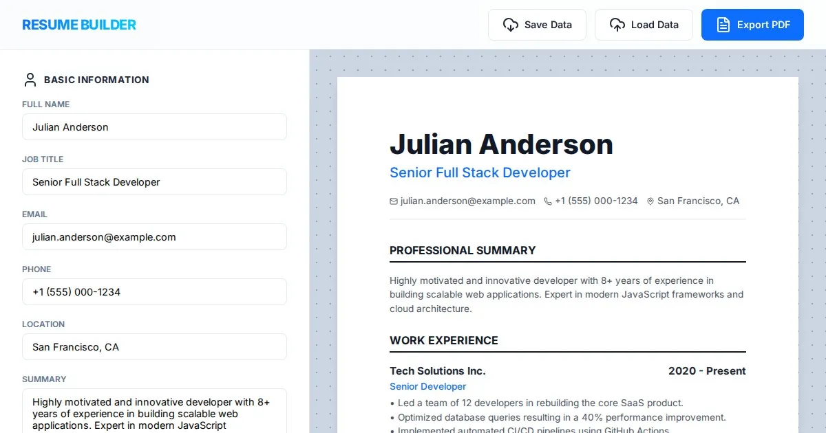 Create professional resumes and CVs for free with this easy online builder. Customize templates, add sections, and export as high-quality PDF files instantly.