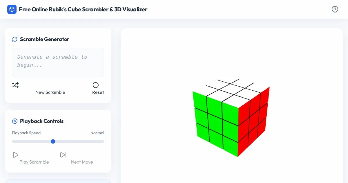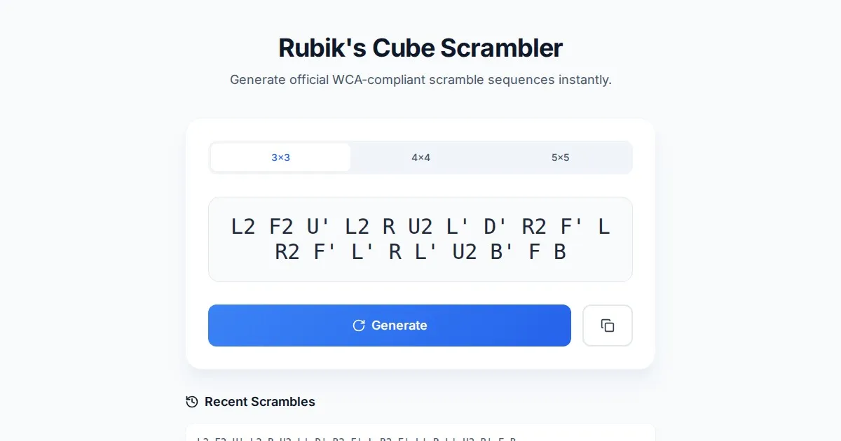 Generate official WCA-style Rubik's Cube scrambles and visualize them instantly in a fully interactive 3D environment. Perfect for practice and training.