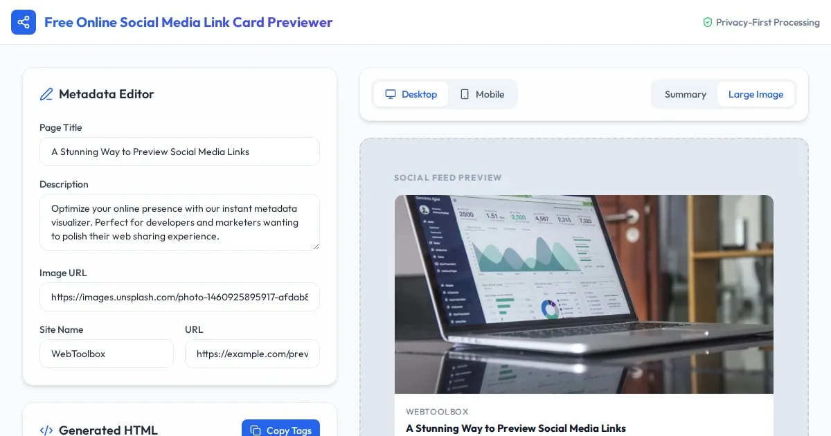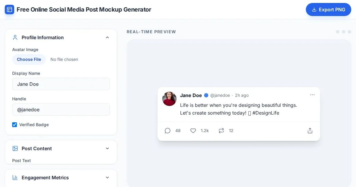 Easily create professional social media post mockups with our free online tool. Customize text, images, and metrics for clean, high-quality post previews.