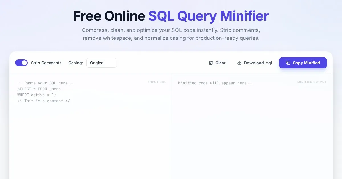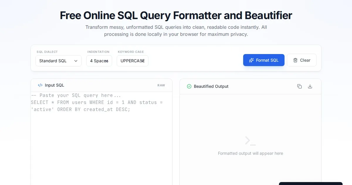 Easily beautify, format, and indent your raw SQL code online for free. This clean, efficient SQL formatter supports MySQL, PostgreSQL, and standard SQL syntax.
