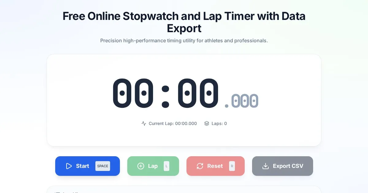 Precision online stopwatch and lap timer for tracking time intervals. Features lap history, split times, and CSV data export in a simple, responsive tool.