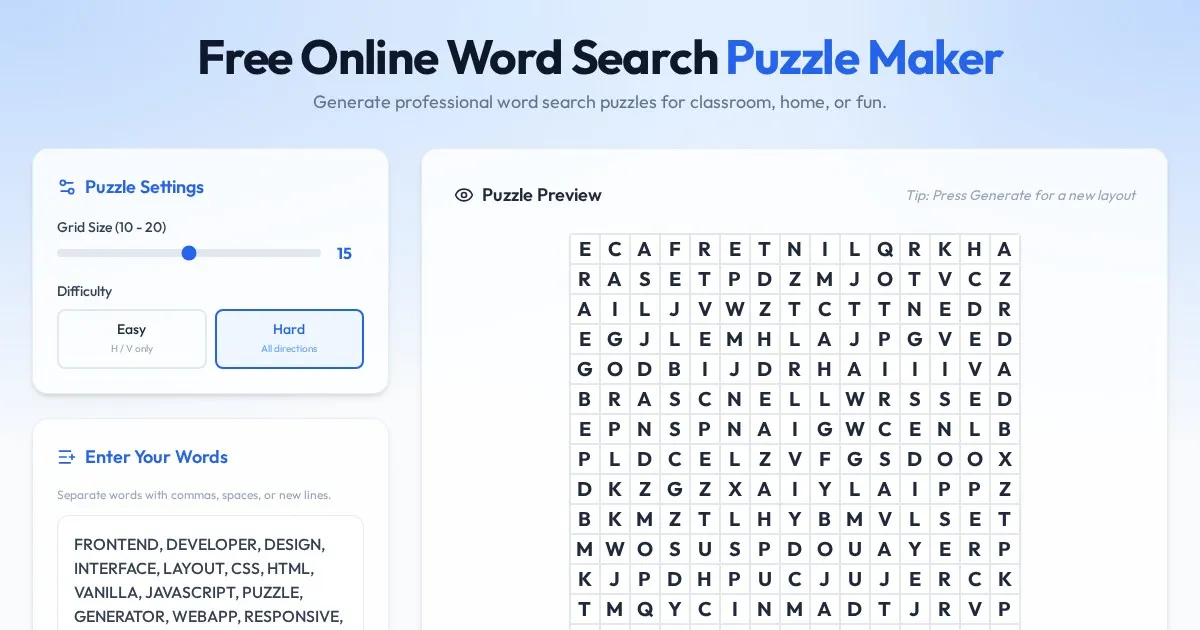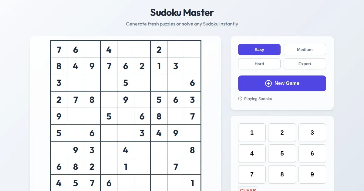 Generate printable Sudoku puzzles or solve difficult Sudoku grids instantly with this free online tool. Perfect for beginners and experts. No ads, fast results.