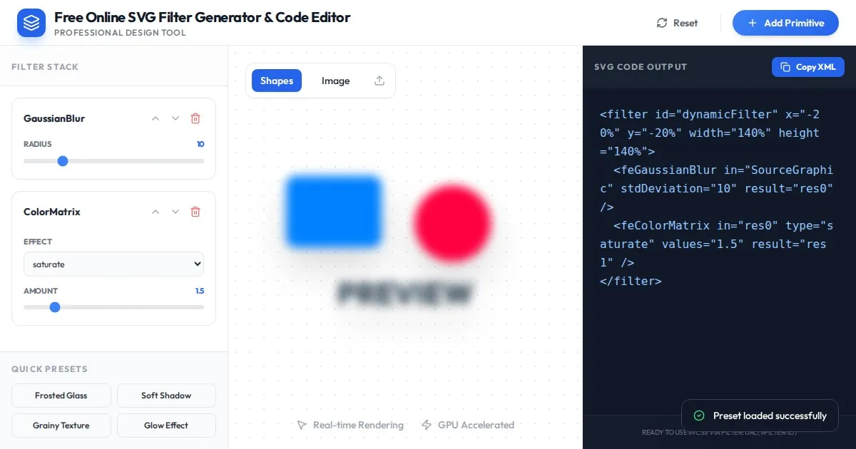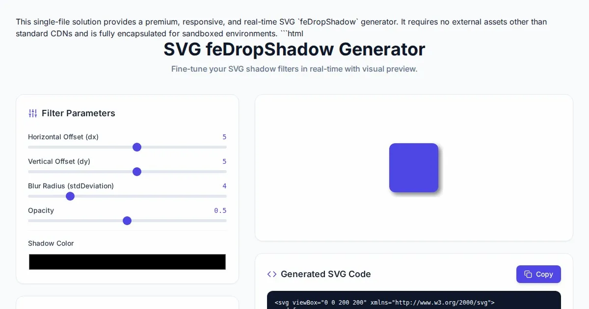 Generate and fine-tune SVG feDropShadow filter effects in real-time. Create custom drop shadows, adjust blur, offset, and color for your web projects instantly.
