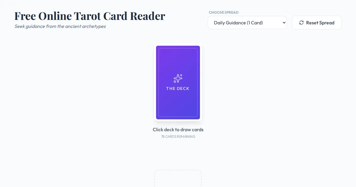 Get a free online tarot reading instantly. Draw cards, learn their meanings, and gain insights with this simple, browser-based tarot card drawer tool. No signup required.