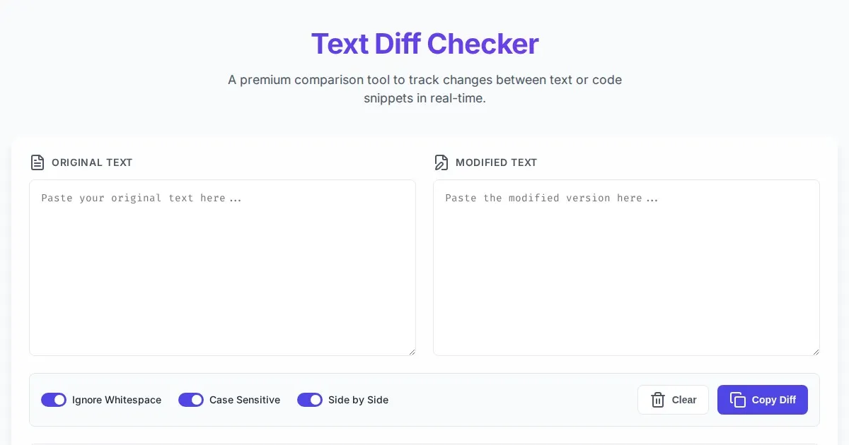Compare two text snippets or code files online instantly with our free text diff checker. Identify differences, additions, and deletions in your code or documents.
