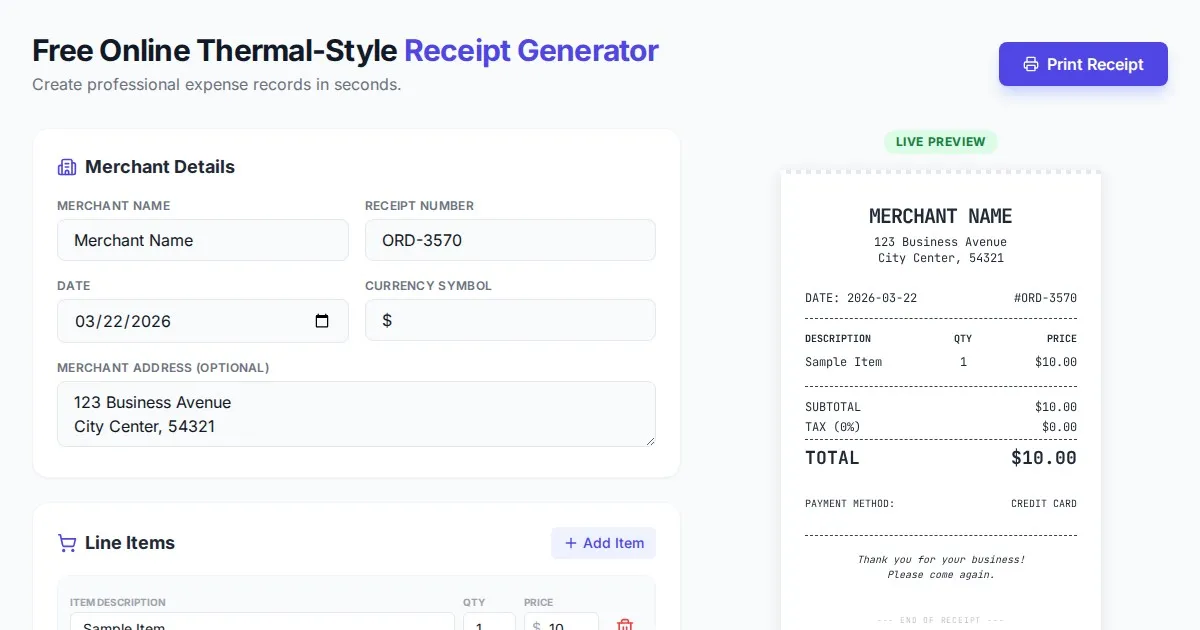 Generate professional, thermal-printer style receipts for business or personal expenses. Customize merchant details, items, tax, and totals in this free tool.