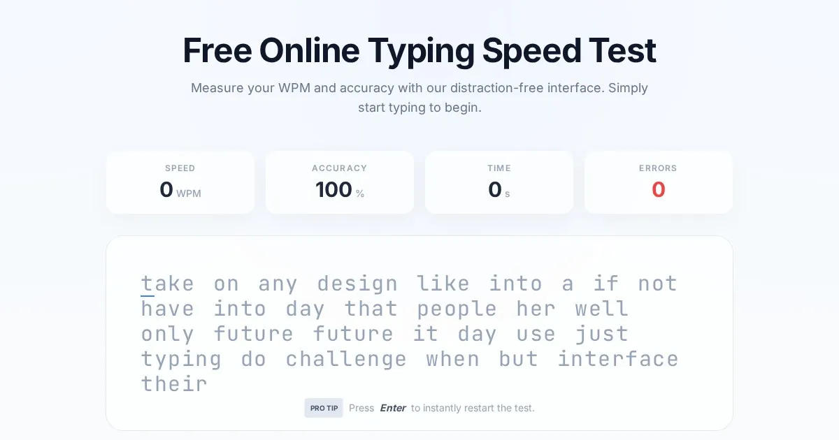Test your typing speed and accuracy with this free, browser-based tool. Track your Words Per Minute (WPM) and improve your typing skills instantly.