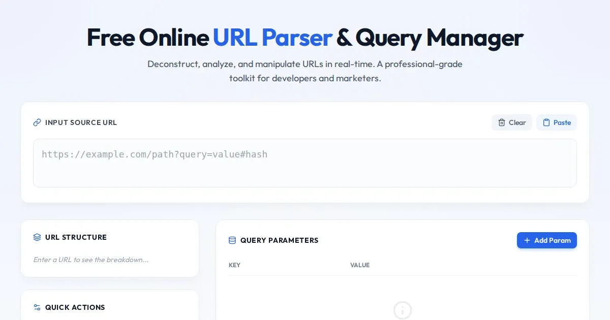 Easily parse complex URLs, extract parameters, and manage query strings with our free online tool. Perfect for developers, marketers, and QA testers.