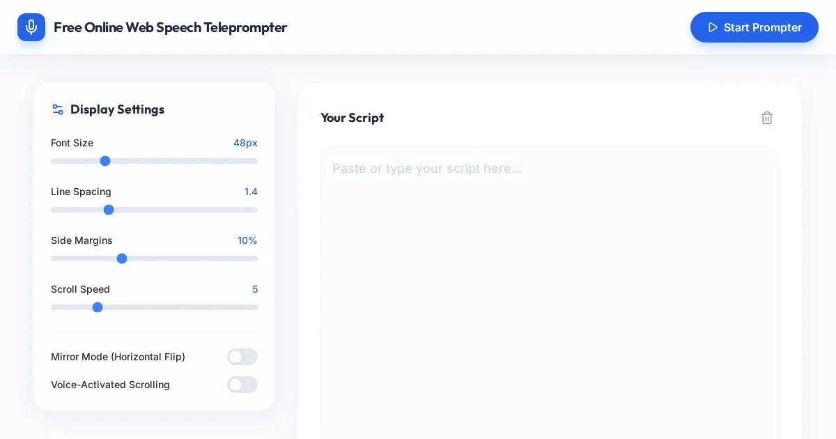 Use this free online teleprompter to scroll text using your voice. Perfect for video creators, public speakers, and streamers. Browser-based and privacy-focused.