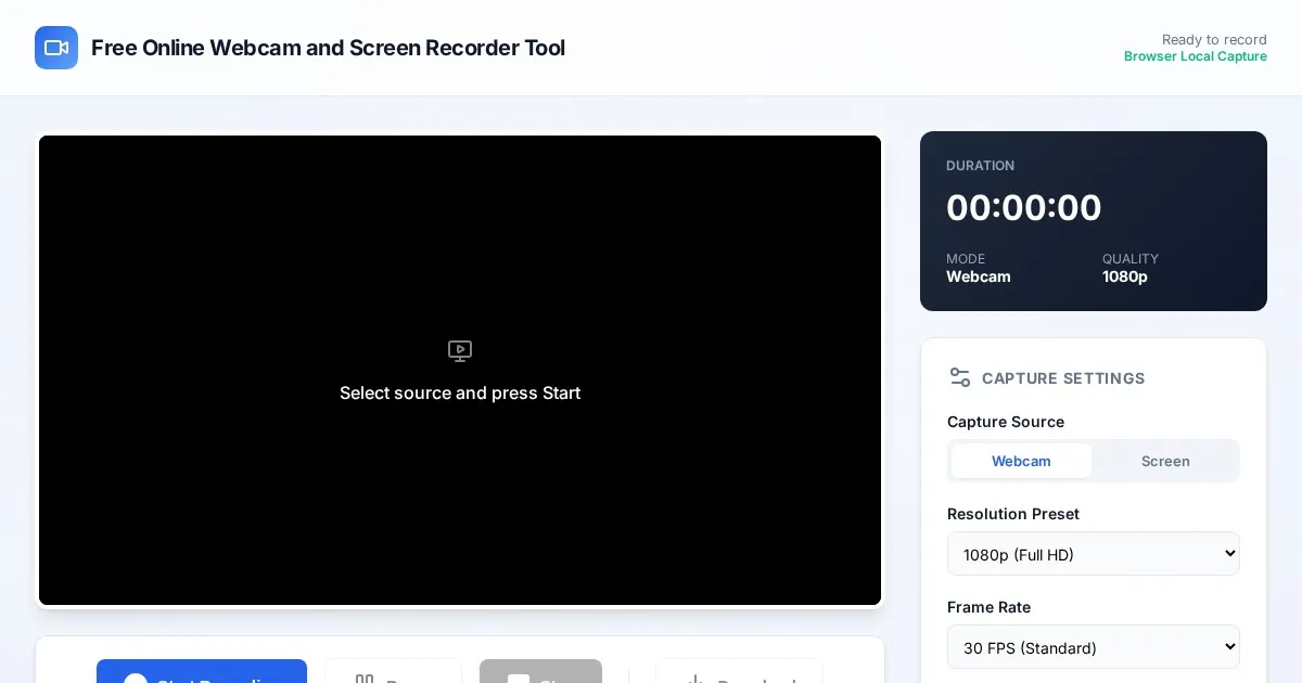 Record your screen and webcam directly in your browser with this free online tool. Safe, private, and no installation required. Capture video instantly.