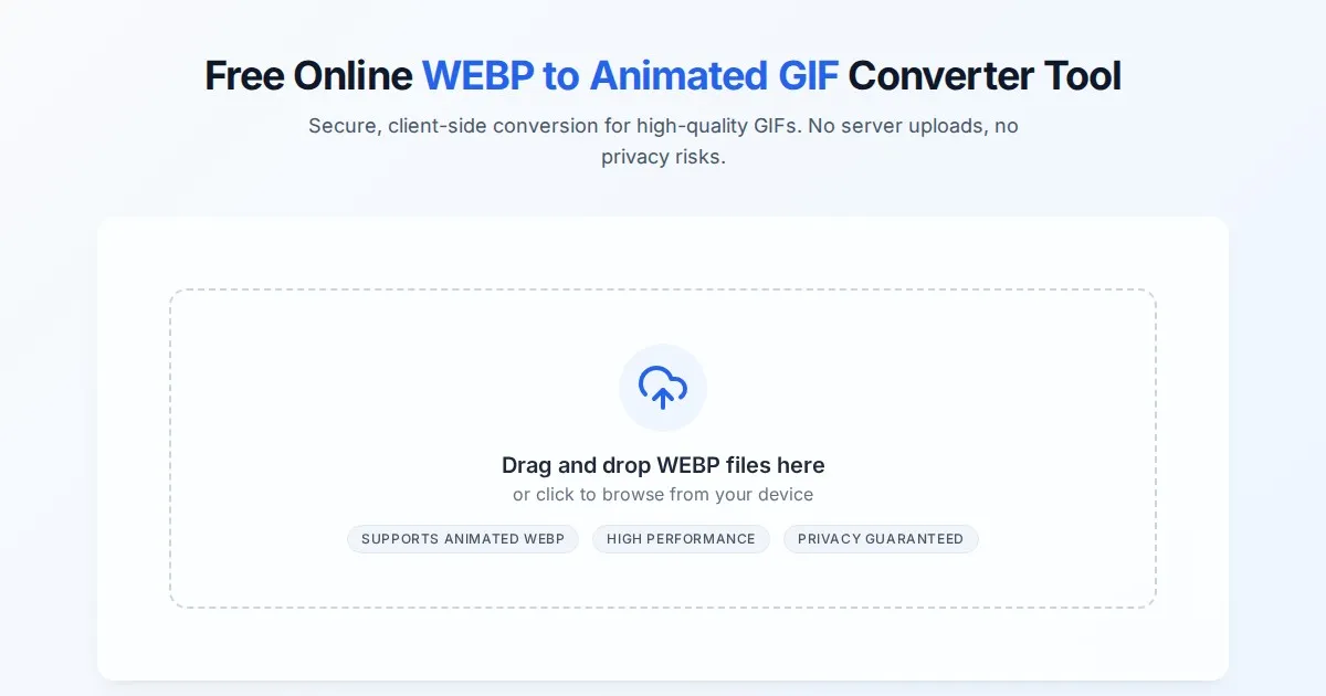 Convert WEBP files to animated GIFs instantly in your browser. Fast, secure, and free online WEBP to GIF converter. No upload required, privacy guaranteed.