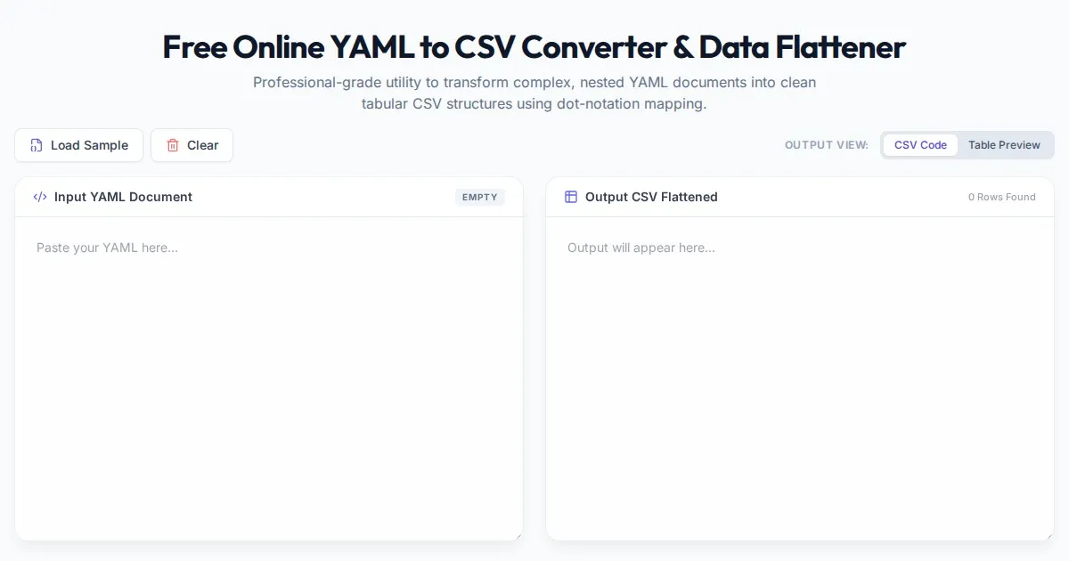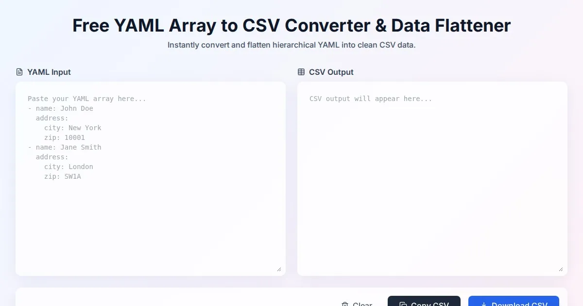 Convert YAML arrays of objects to CSV format online. Easily flatten complex data structures, download as CSV files, and preview tabular data instantly.