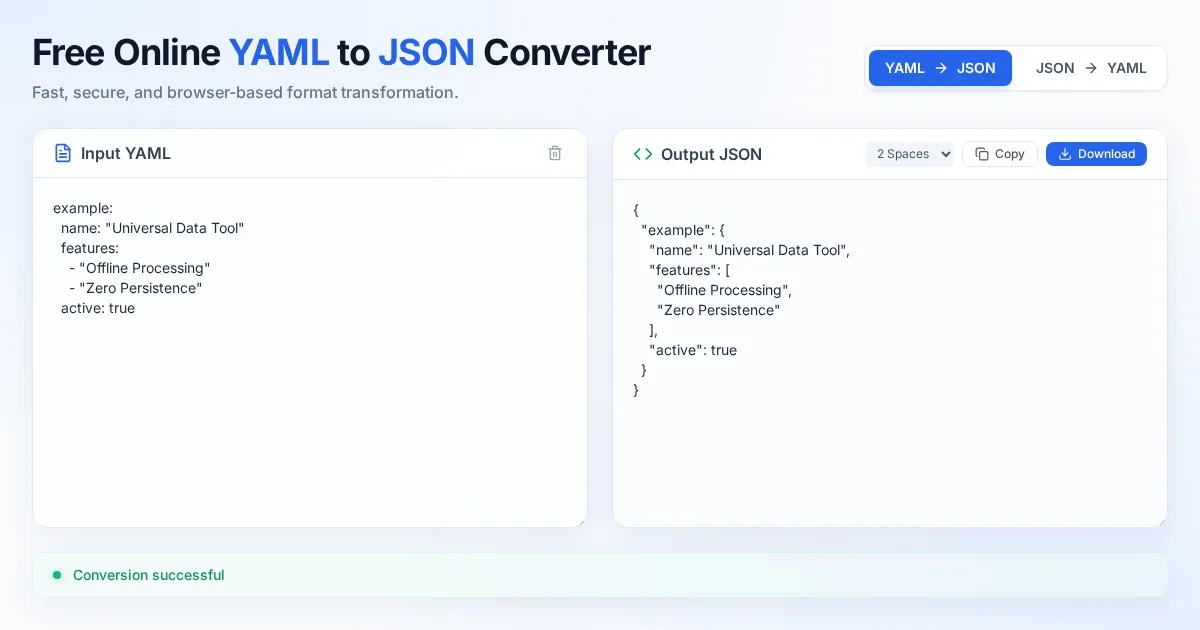 Instantly convert YAML to JSON or JSON to YAML with this free, browser-based tool. Perfect for developers needing safe, client-side data serialization.