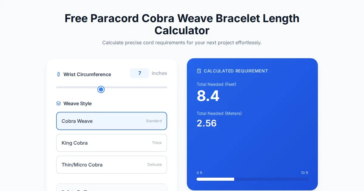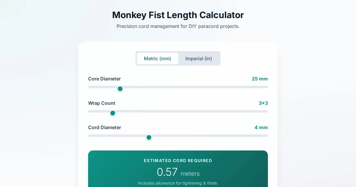 Use this free paracord monkey fist length calculator to determine exactly how much cord you need. Perfect for 550 paracord projects, bearings, and beads.