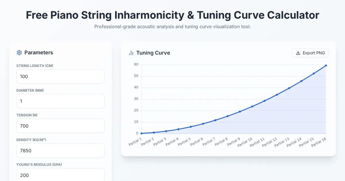 Visualize piano string inharmonicity with our free online tool. Calculate tuning curves, partial deviation, and stiffness coefficients for acoustic pianos.