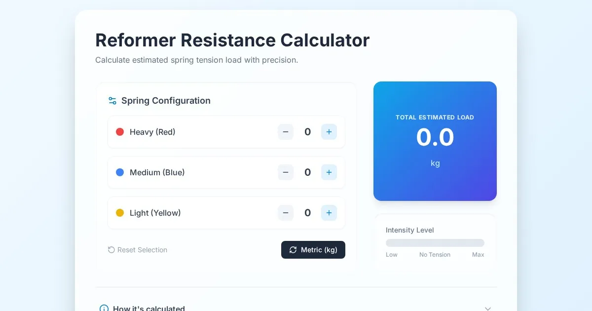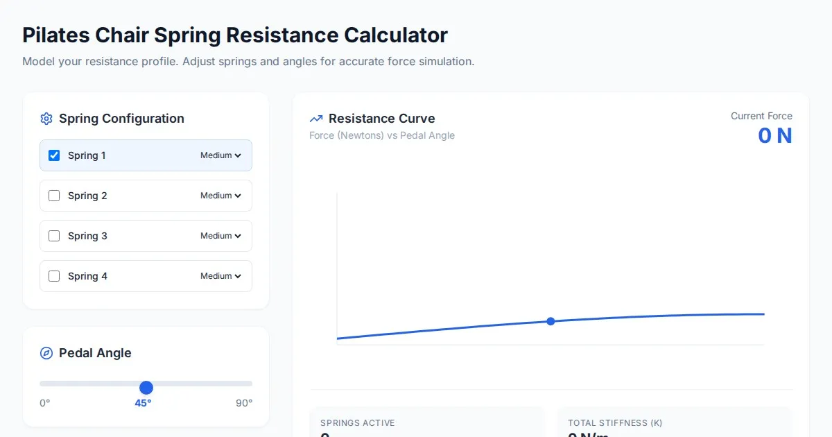 Calculate and visualize Pilates chair pedal spring resistance with this free, browser-based tool. Perfect for instructors to analyze tension and spring force.