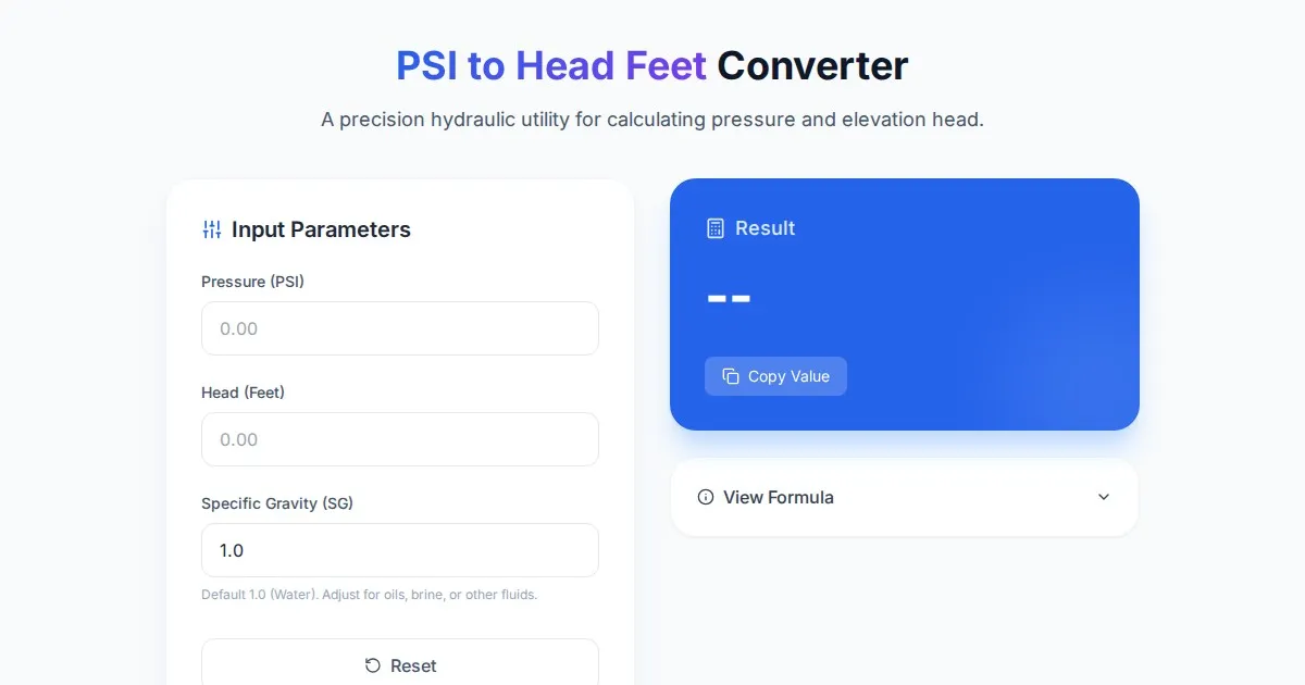 Accurately convert water pressure from PSI to head feet. Use our free, web-based hydraulic pressure converter for plumbing, irrigation, and pump system design.