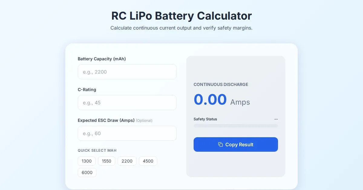 Calculate the continuous amperage capacity of your RC LiPo batteries instantly. Enter mAh and C-rating to determine the safe power output for your RC car.