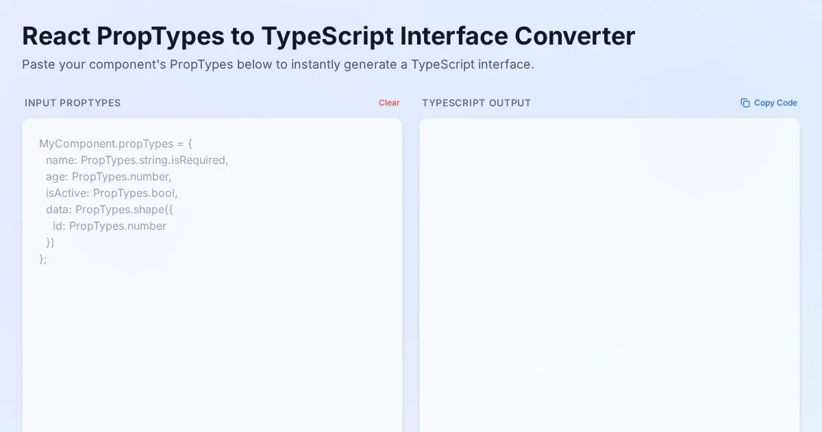Instantly convert React PropTypes definitions to clean TypeScript interfaces with our free, secure, client-side browser tool for web developers.