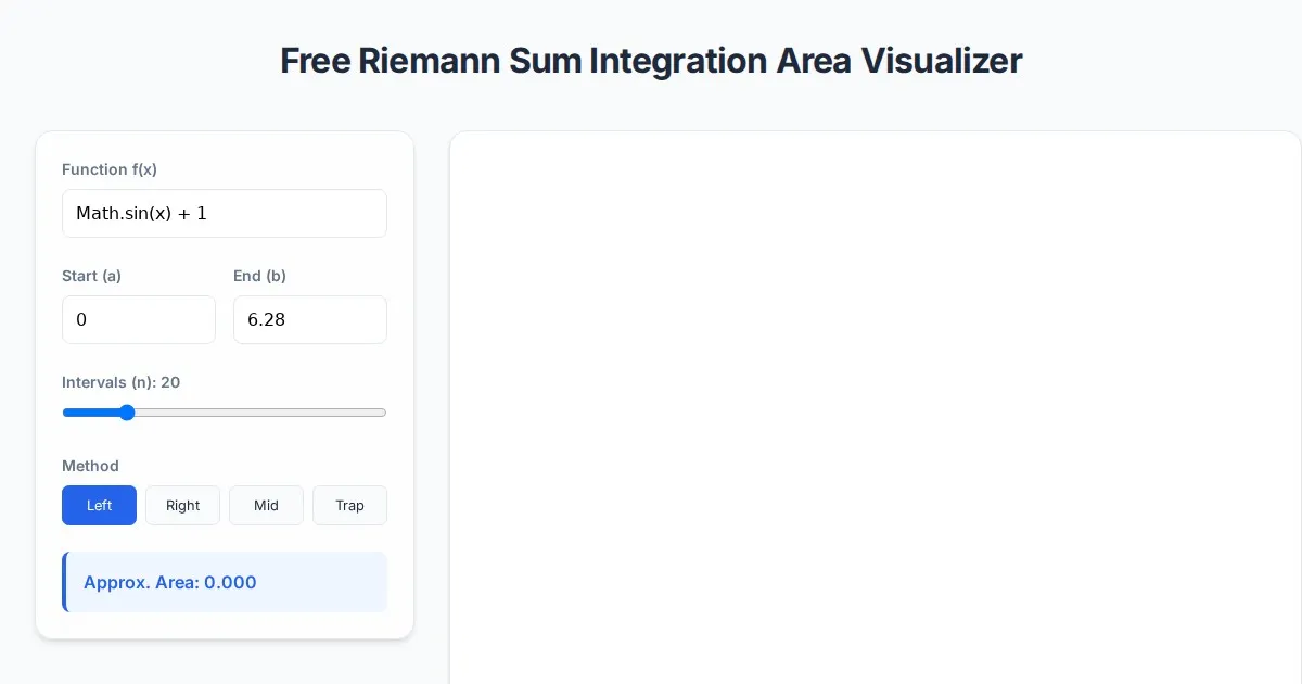 Visualize calculus integration with this free interactive Riemann Sum calculator. Accurately calculate area under curves using left, right, midpoint, or trapezoid rules.
