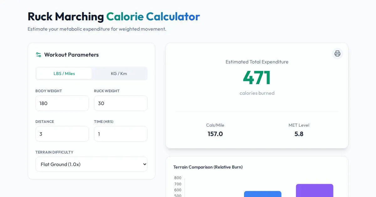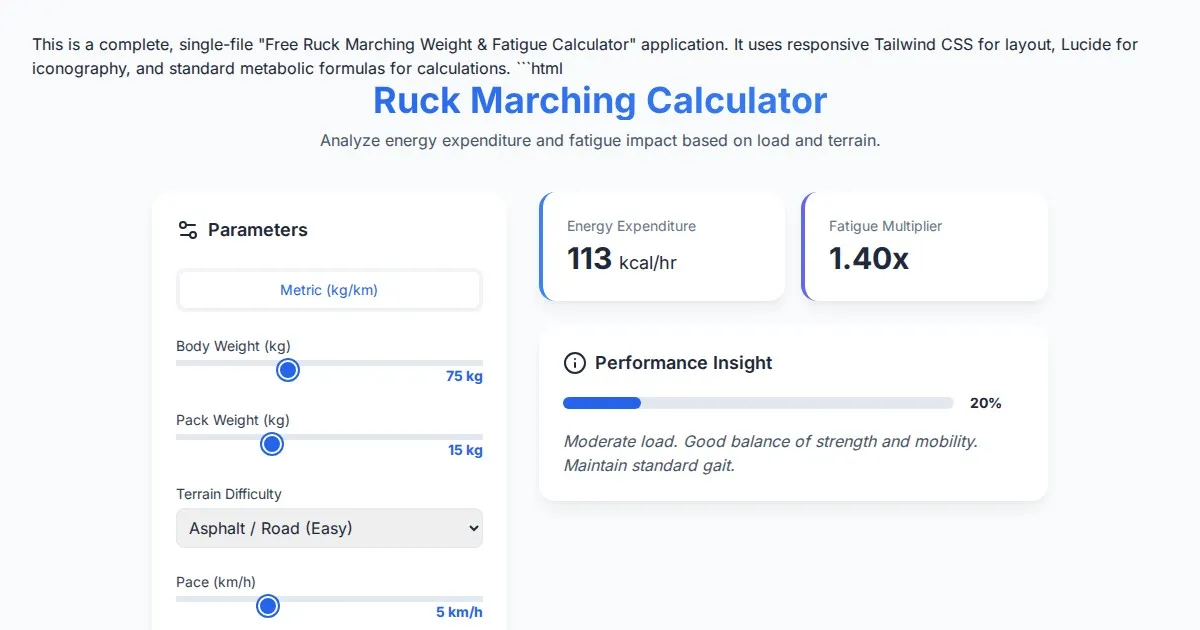 Accurately calculate ruck marching fatigue multipliers based on body weight, load weight, terrain, and distance. Optimize your endurance training today.