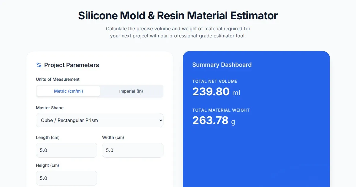 Accurately calculate the exact amount of silicone rubber needed for your molds. Free tool to estimate volume, weight, and wall thickness for DIY resin casting.