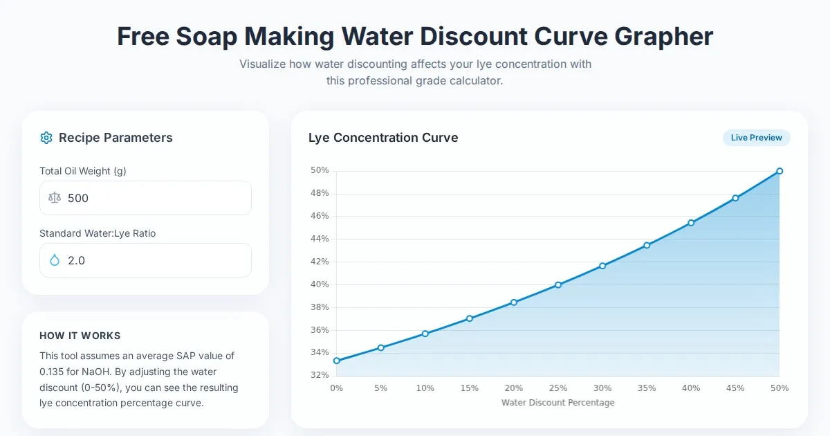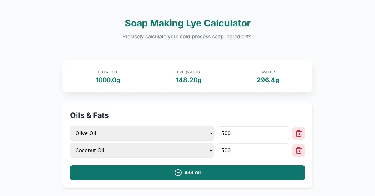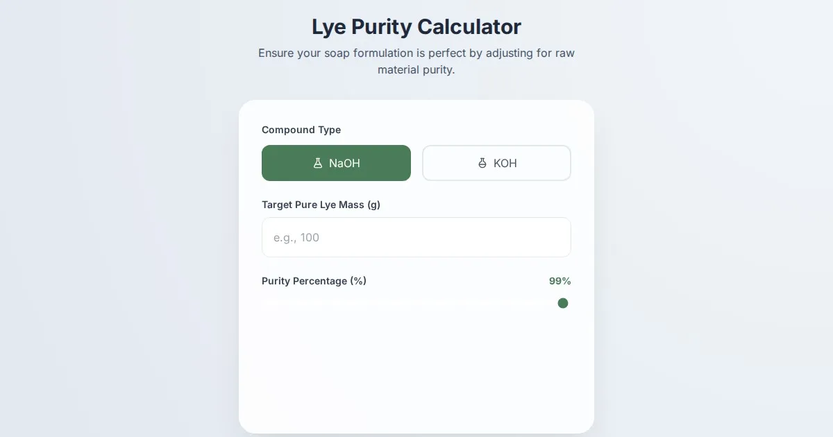 Calculate precise soap making lye amounts based on purity percentages. Ensure safe, balanced saponification with our easy-to-use lye adjustment tool.