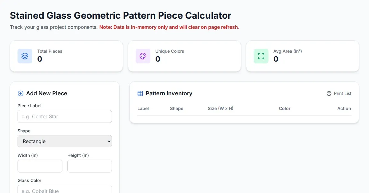 Use this free online stained glass project manager to count geometric panel pieces, track glass colors, and organize your cutting list effectively for any project.