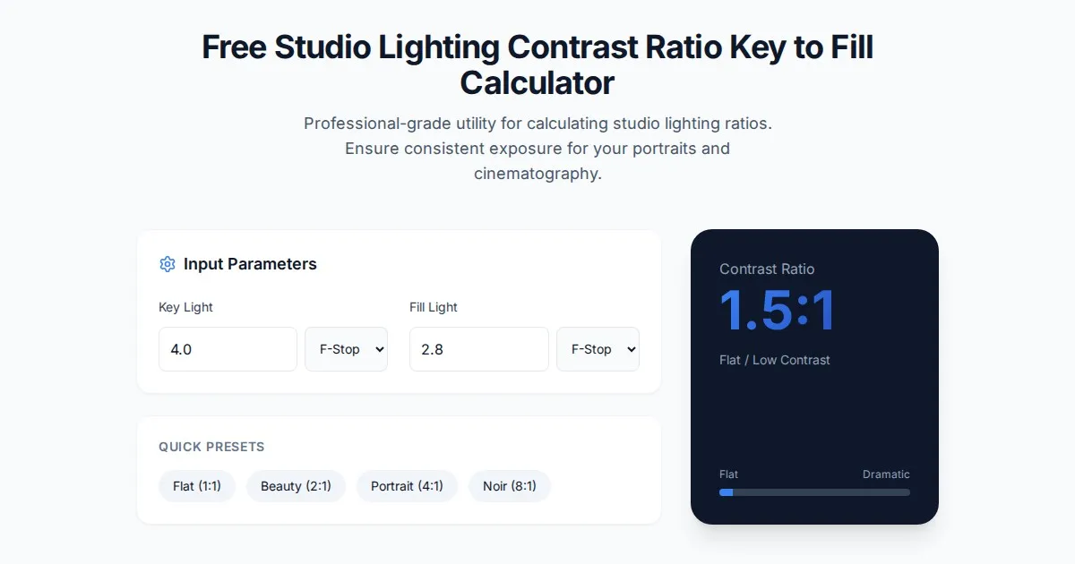 Calculate your studio lighting key-to-fill ratio effortlessly. Optimize your photography and cinematography exposure with this free lighting contrast tool.