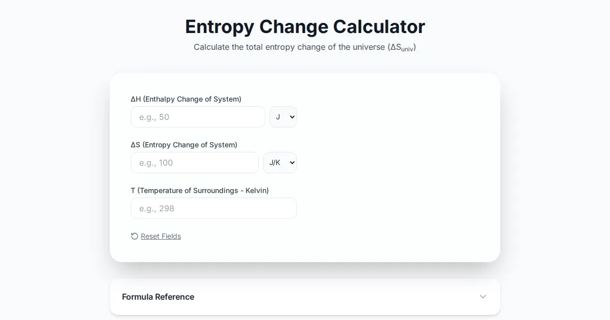 Easily calculate entropy change for systems and surroundings. Determine spontaneity and reaction equilibrium with this free, accurate thermodynamics calculator.