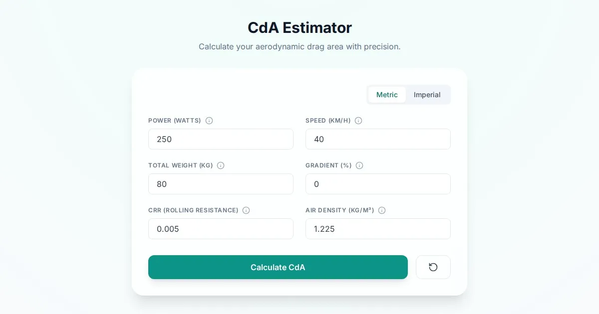 Calculate your cycling aerodynamic drag area (CdA) instantly. A free, easy-to-use tool for triathletes to analyze power, speed, and aerodynamic efficiency.