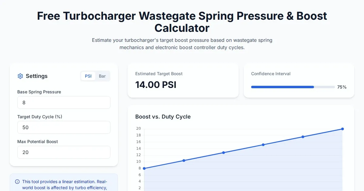 Use our free tool to calculate turbocharger wastegate spring pressure vs target boost. Accurate estimation for automotive enthusiasts and engine tuners.