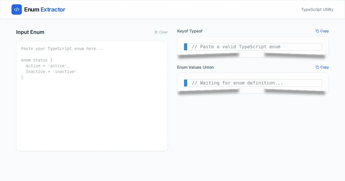 Instantly extract TypeScript enum keys and values into union types with our free, browser-based TypeScript enum utility tool. No setup, just paste and copy.