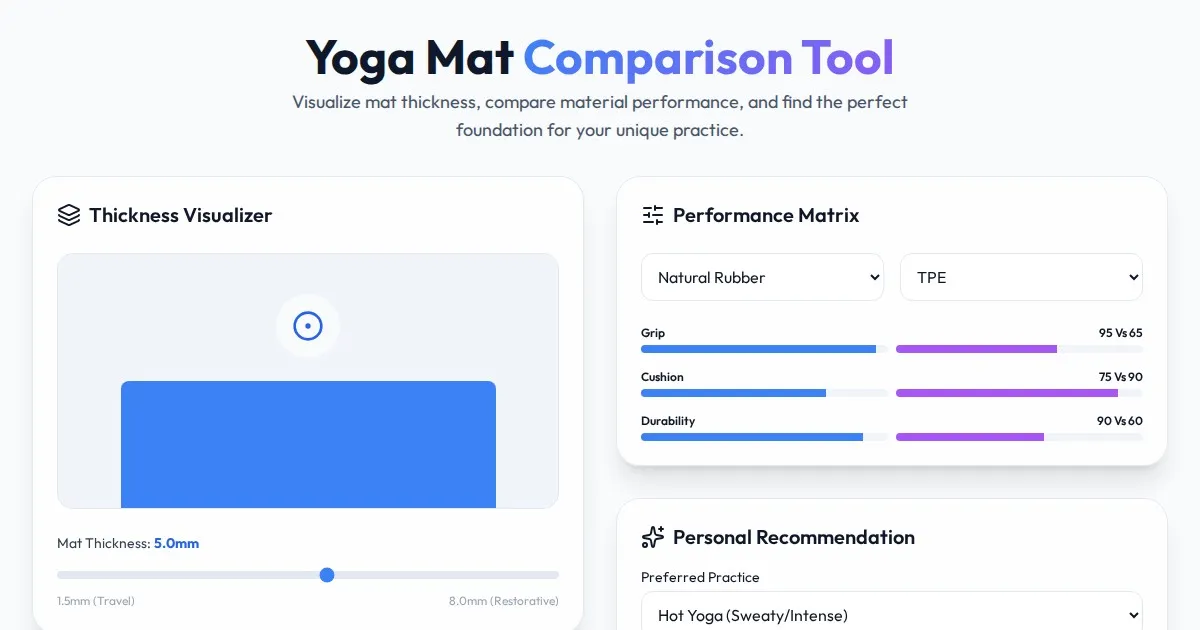 Use our free yoga mat thickness visualizer to compare cushioning levels and grip performance. Find the perfect mat density for your joint support and practice.